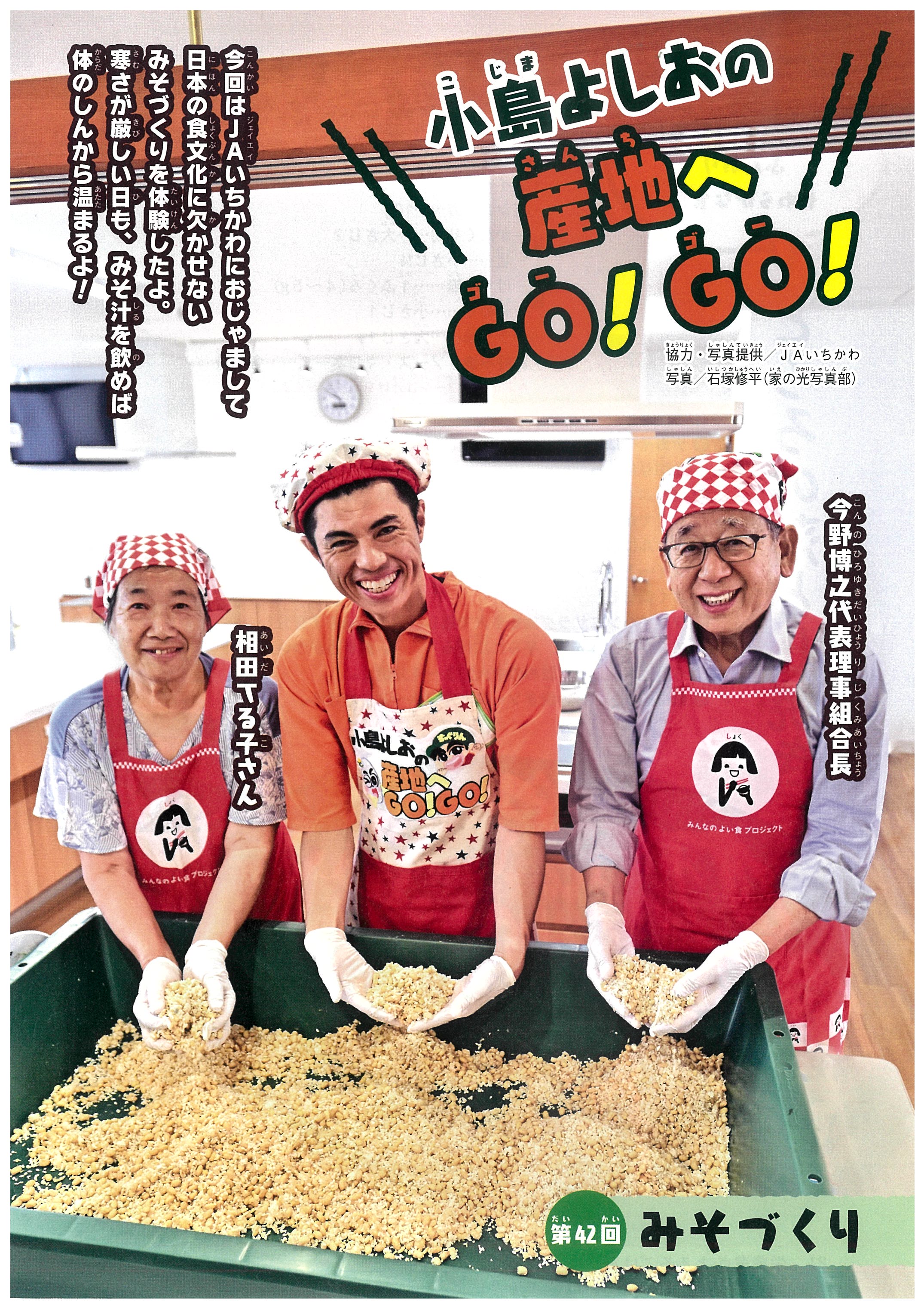 タレントの小島よしおさんによる連載企画。今月は、千葉県JAいちかわにうかがって、日本の食文化に欠かせないみそづくりを体験しました。女性部の相田てる子さんに、みそづくりの工程を教わり、あつあつのみそおにぎりや、根菜たっぷりのみそ汁などをいただき、手づくりみそをじっくり味わいました。