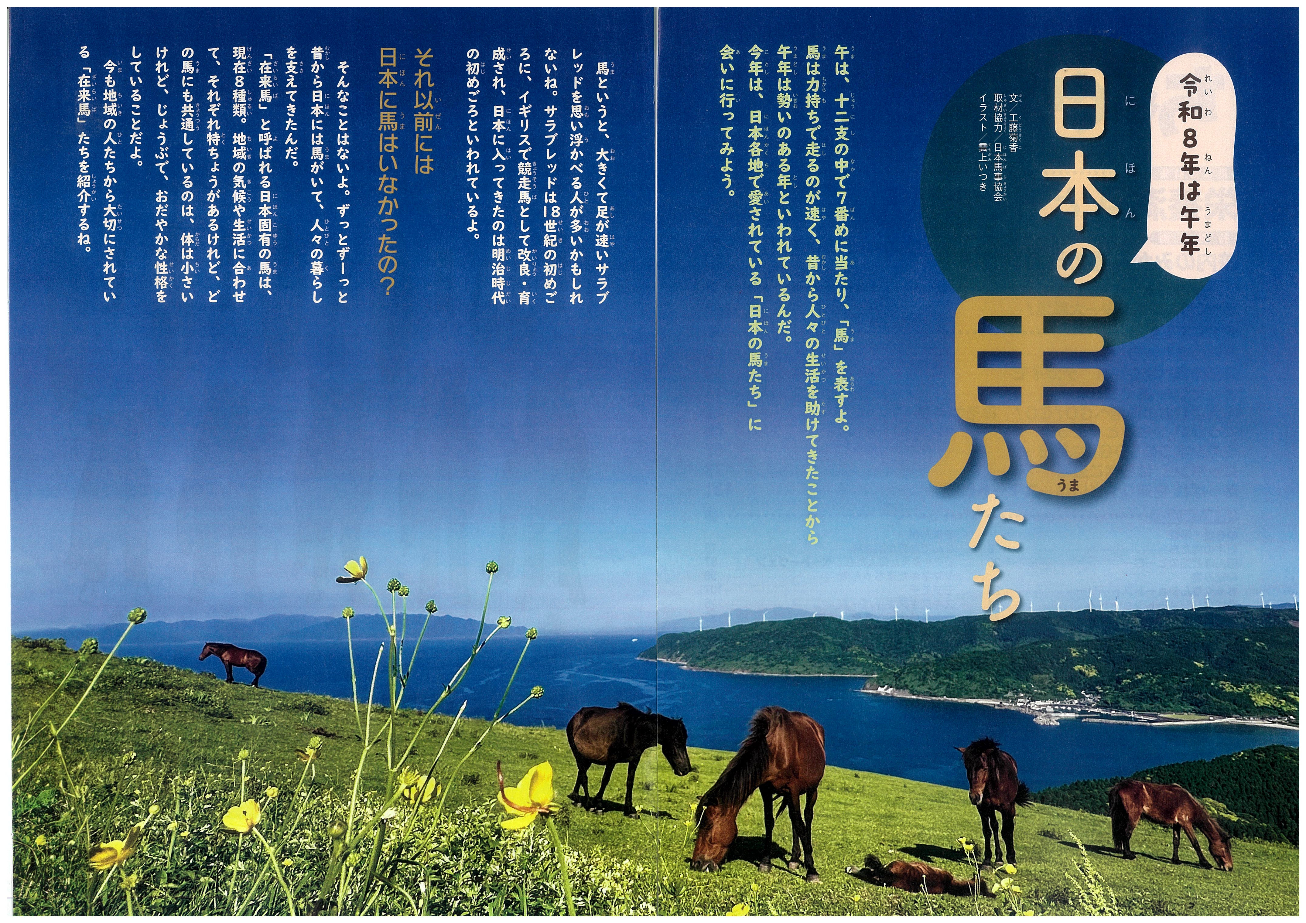 令和8年は午年。それにちなんで、馬について特集しているよ。馬は力持ちで走るのが速く、昔から人々の生活を助けてきたことから、午年は勢いのある年といわれているんだ。特集では、日本に現在8種類いる「在来馬」を紹介しているよ。宮古馬、木曽馬、野間馬など、各地域で育った馬の特ちょうや、出会える場所を掲載しているので、ぜひ読んでね。