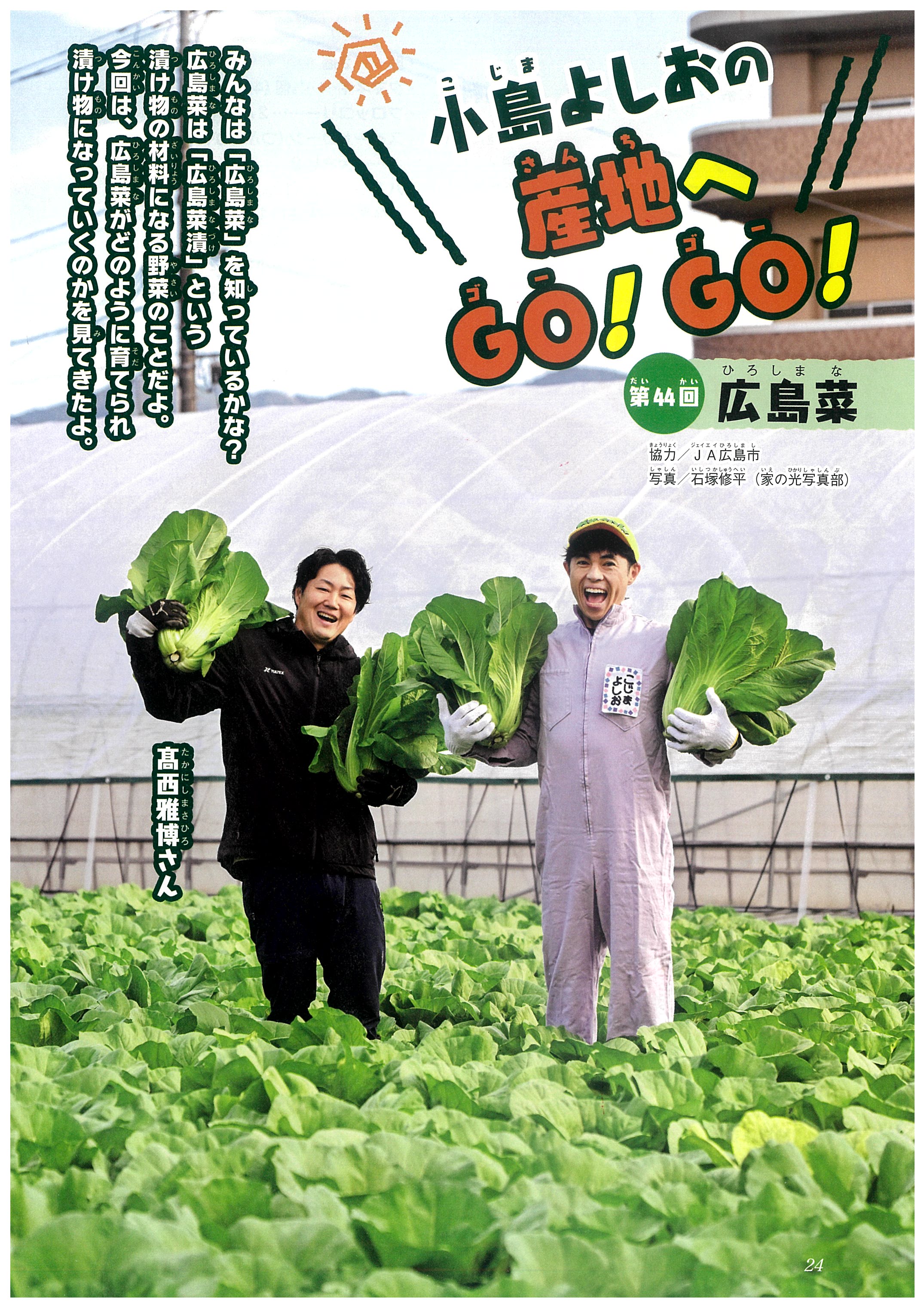 タレントの小島よしおさんが、産地を訪ねる人気連載。今月は、広島県広島市(JA広島市管内)の広島菜の農家を訪ねます。「広島菜漬」という漬け物の材料になる、アブラナ科の広島菜は、1株が約2キロにもなるほど大きく、漬け物にすると歯ごたえがあり、ピリッとした風味があるのが特ちょうです。農家の髙西雅博さんの畑や、広島菜の加工場を訪れて、広島菜の収穫をしたり、漬け物ができるまでを見学したりする様子をレポートします。
