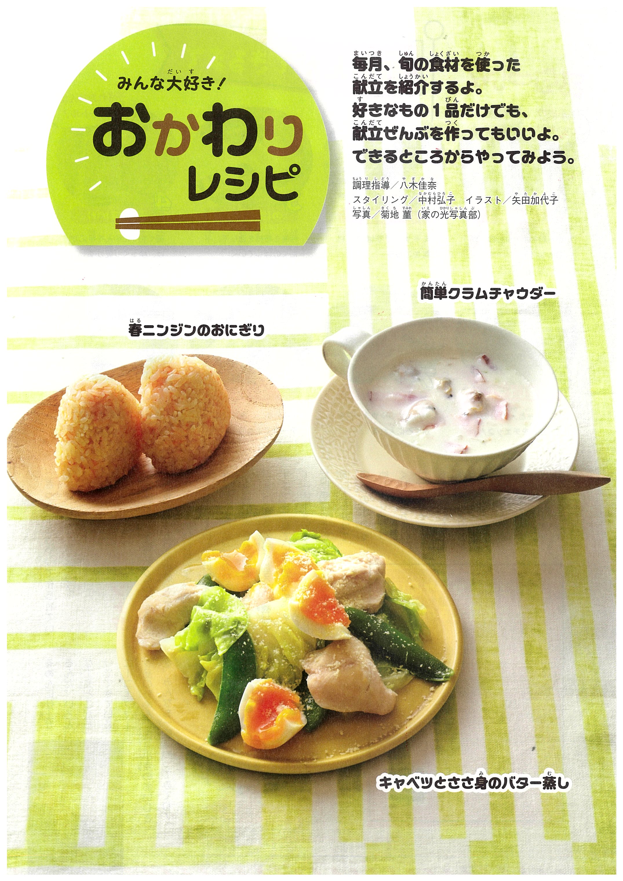 毎月、旬の食材を使った献立を紹介する連載です。今月は、フライパンで手軽に作れるキャベツとささ身のバター蒸し、栄養満点の春ニンジンのおにぎり、クリーミーな簡単クラムチャウダーを紹介しています。好きなもの1品だけでも、作ってみてください。
