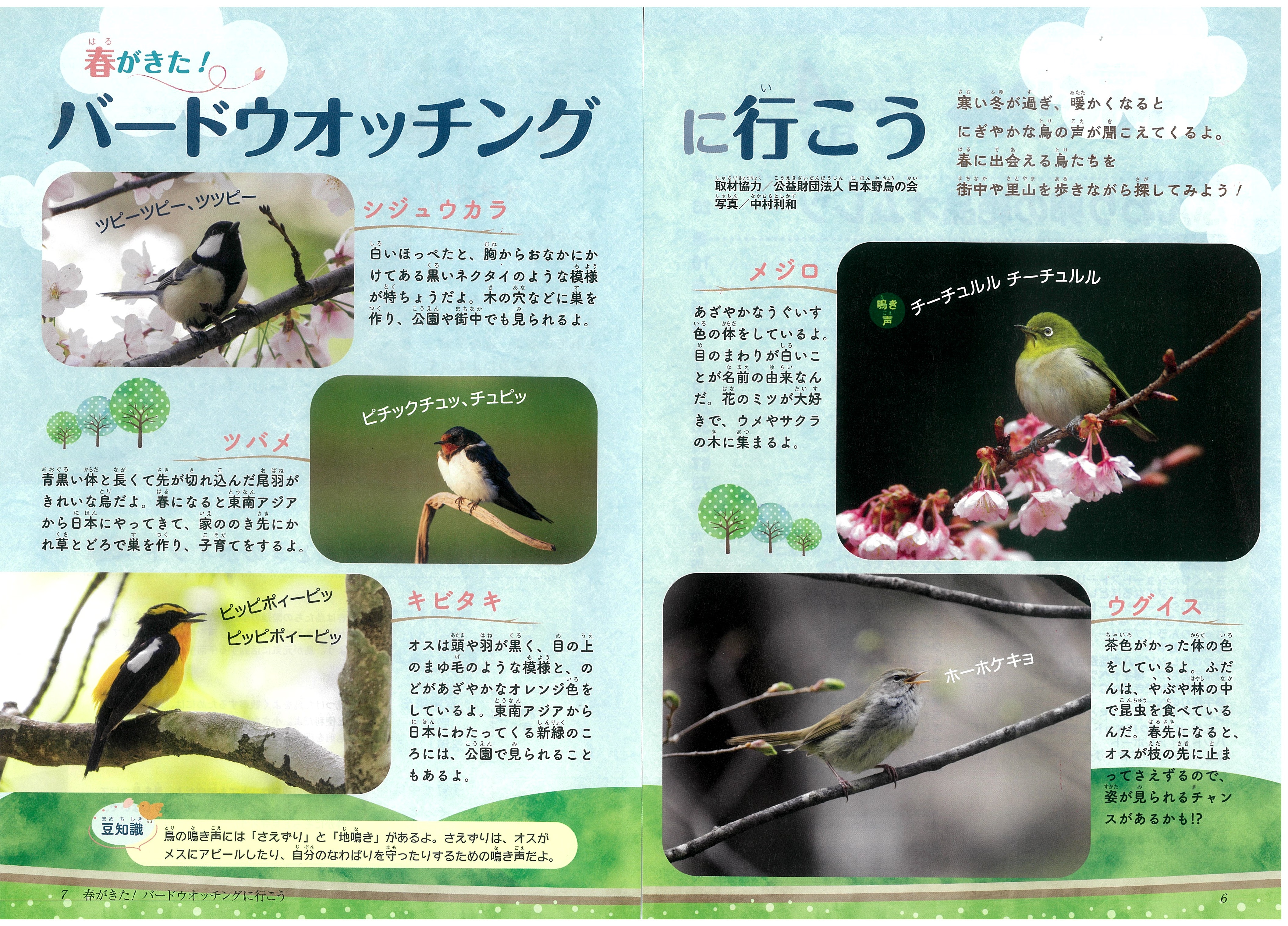 寒い冬が過ぎ、暖かくなると、にぎやかな鳥の声が聞こえてきます。チーチュルル チーチュルルと鳴くメジロや、ホーホケキョと鳴くウグイスなど、春に見られる代表的な鳥を紹介します。街中や里山を歩きながら、ぜひ探してみてね。