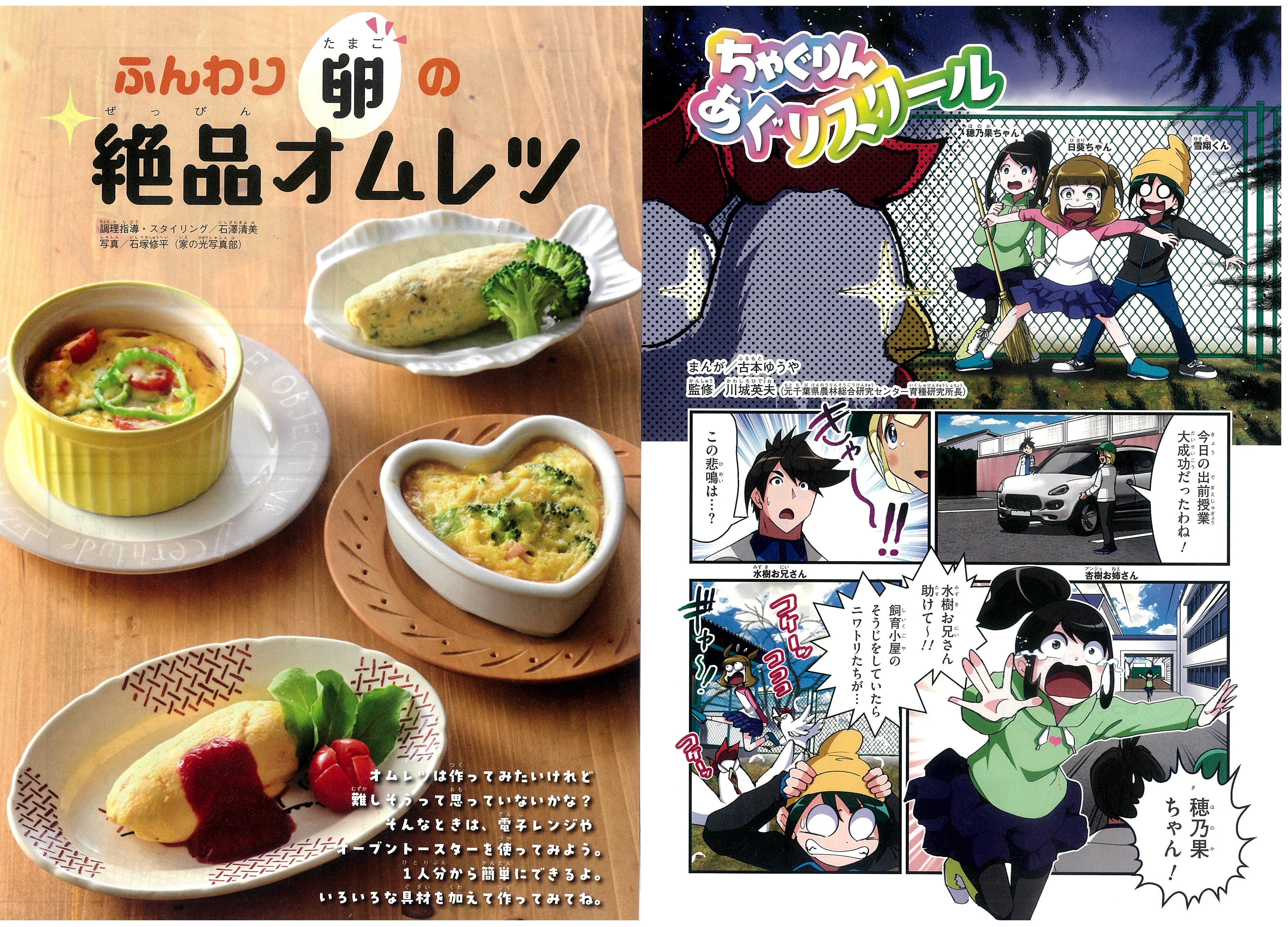 「ちゃぐりんあぐりスクール」では、穂乃果ちゃんたちが大さわぎしながら、ニワトリの飼育小屋のそうじに四苦八苦。ちょうど水樹お兄さんと、杏樹お姉さんに出会い、ニワトリの特ちょうや、エサについて教わります。穂乃果ちゃんは、ニワトリに慣れたかな!? 「食&農企画」では、電子レンジやオーブントースターで作れるオムレツを紹介。1人分から簡単に作れるので、朝ごはんやお弁当のおかずにもおすすめです。