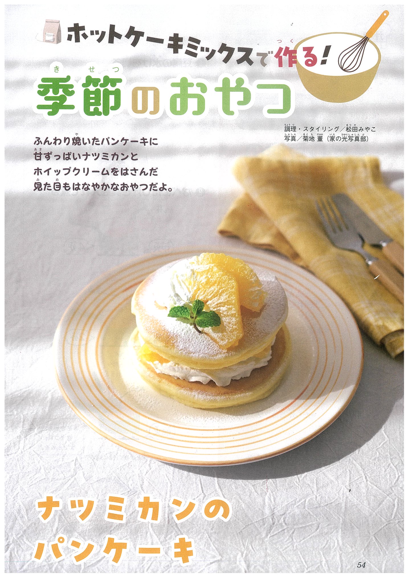 今月号からホットケーキミックスを使ったおやつの連載が始まります。初回は、甘ずっぱいナツミカンとホイップクリームをはさんだパンケーキです。ぜひお試しください。