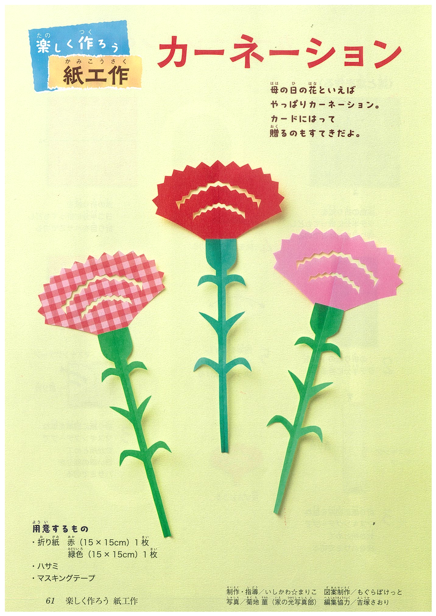 母の日の花といえばカーネーション。折り紙で色とりどりのカーネーションを作ってプレゼントしよう。折り紙に図案を重ねて切るだけと、とても簡単に作れます。