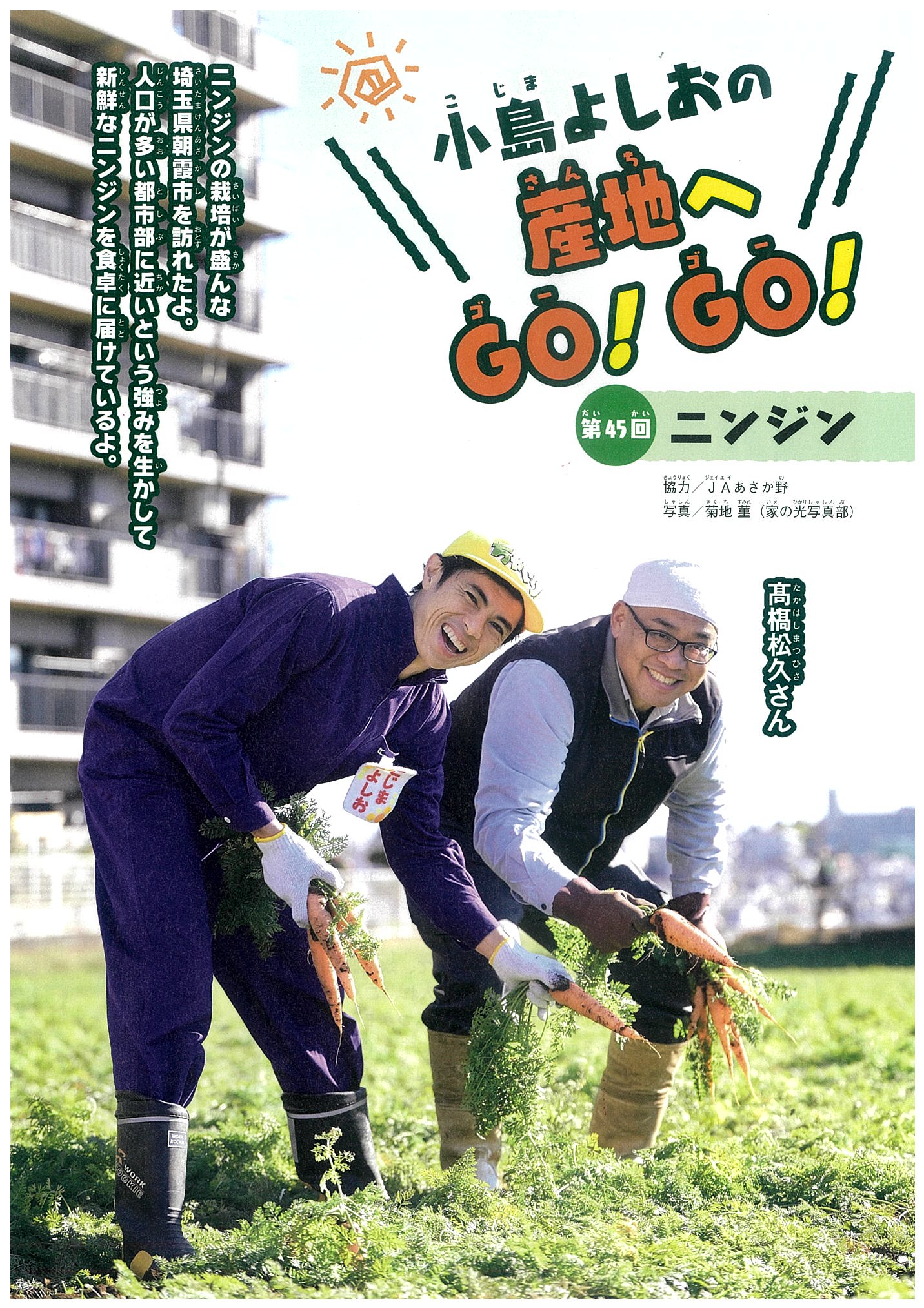 タレントの小島よしおさんが、産地を訪ねる人気連載。今月は、埼玉県朝霞市(JAあさか野管内)のニンジン農家を訪ねます。朝霞市は古くからニンジンの栽培が盛んな地域で、とくに秋冬ニンジンは甘みが強く、色がこいのが特ちょうです。専用のニンジン収穫機を使って収穫をした後、選果作業を見せてもらいます。またJAあさか野女性部のみなさんに、ニンジンの炊きこみピラフを教わる様子をレポートします。
