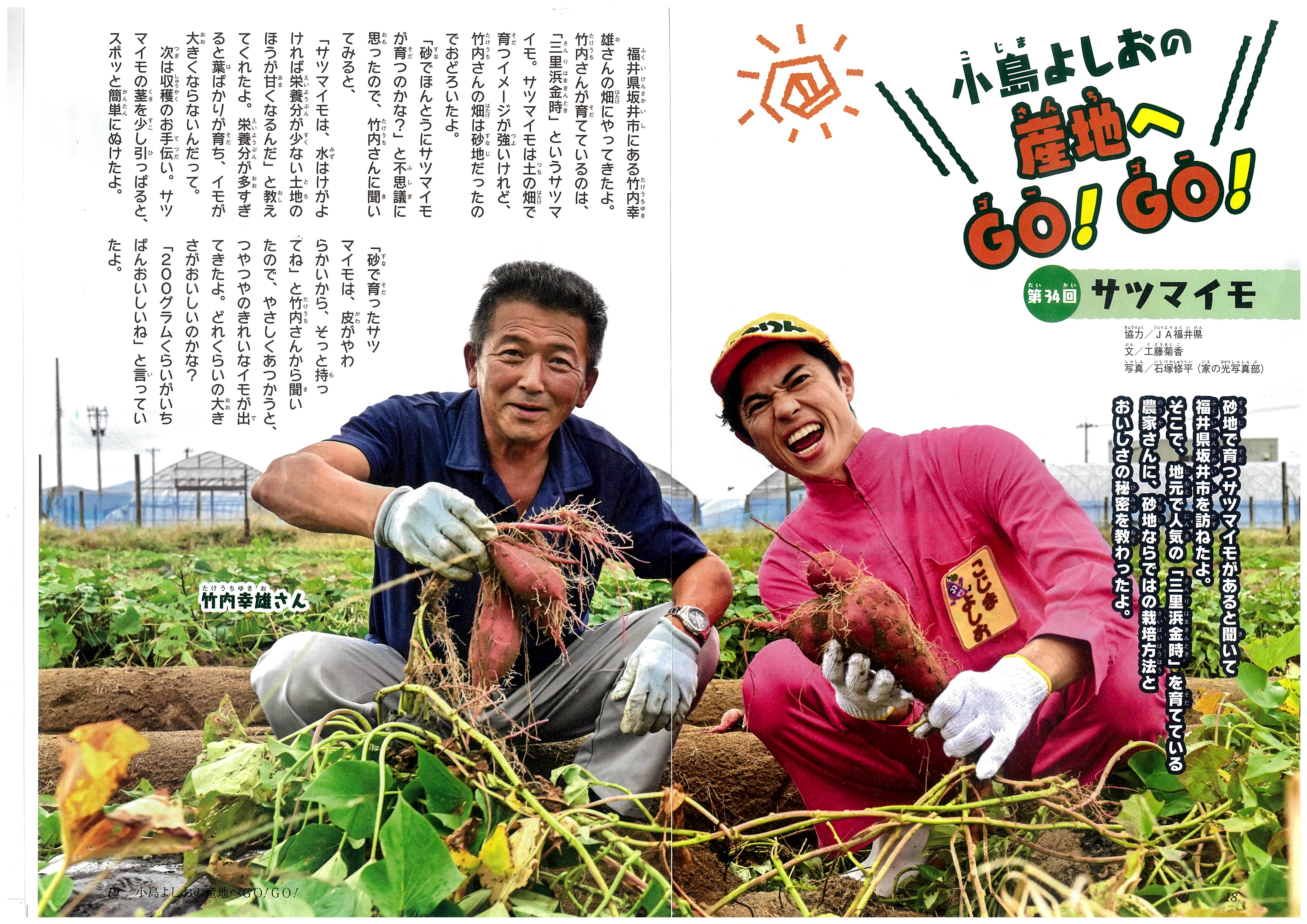 タレントの小島よしおさんによる連載企画。今月は福井県坂井市(JA福井県管内)のサツマイモ農家を訪ねて、サツマイモの収穫をいっしょに行います。「三里浜金時」という砂地で育つサツマイモは、うすくてきれいな皮とやわらかさが特ちょうです。JA福井県女性部坂井支部のみなさんには、サツマイモごはんのレシピを教わりました。