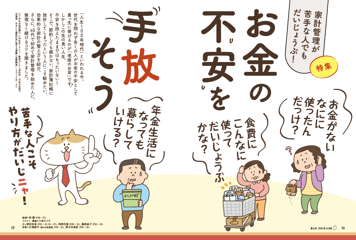 「人生100年時代」といわれる今、世代を問わず多くの人がお金の不安として真っ先に挙げるのが「老後のお金」です。しかしこの先の長い人生、不安を抱えたままではもったいない! そこで、節約しても続かない、家計簿記帳に挫折してしまったという人にこそ勧めたい、効果的な家計の整え方を紹介。さらに、60代で初めて家計管理を始めた人に、無理なく続けるコツを聞きました。